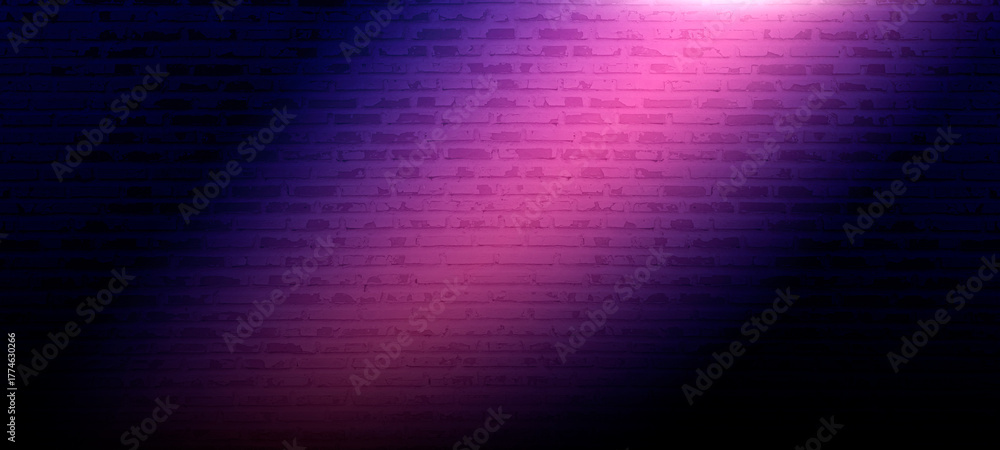 Empty dark scene neon spotlights blue and purple beams background reflection on brick wall with peeling plaster floor studio room texture for banner interior decoration product display backdrop #1774630266