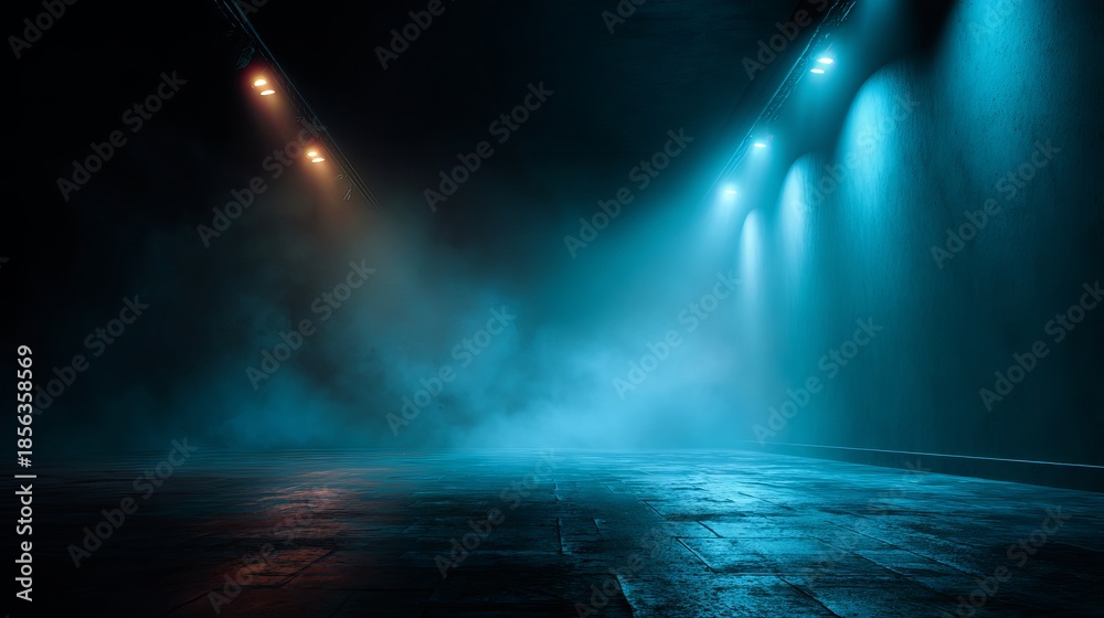 Empty dark street with asphalt floor, dark blue night scene, neon glow and spotlights, drifting smoke in studio room, cinematic urban background with copy space #1856358569