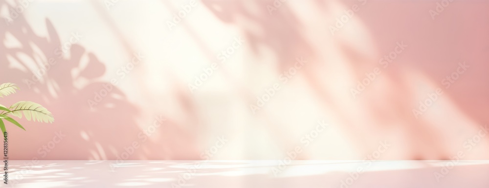 Empty pastel pink studio background with leaf shadows. Soft light, shadows create delicate spring summer mood. Suitable for beauty products items. 3d mockup template for product placement. Ideal for #1228356419