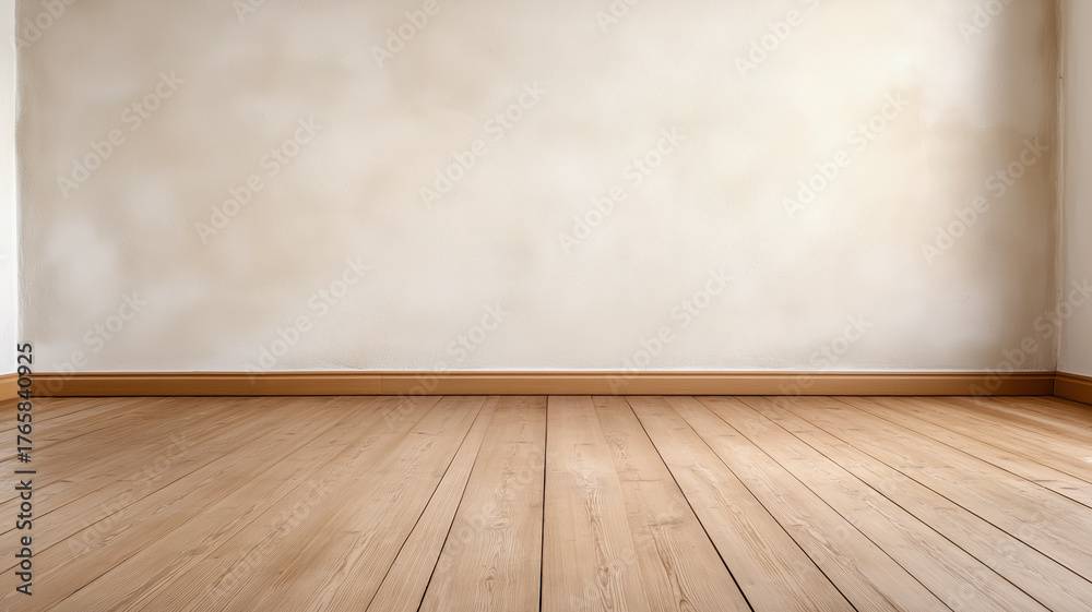 Empty room featuring a new wooden plank floor and a plain light beige wall, creating a clean background for design or construction themes #1765840925