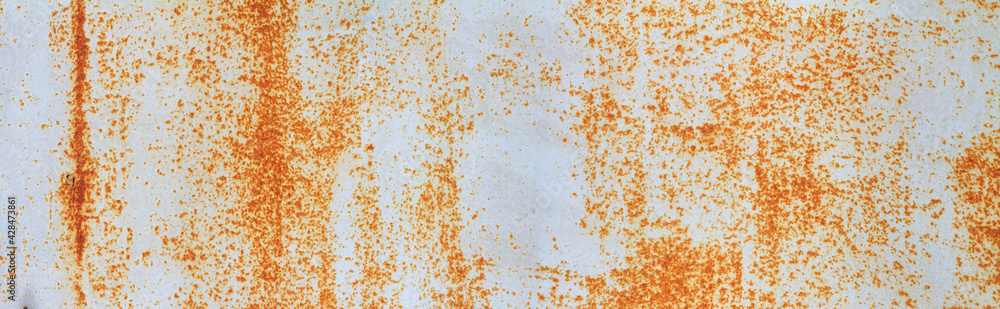 Empty rusty corrosion and oxidized background, horizontal banner. Grunge rusted metal texture. Worn metallic iron wall #428473861