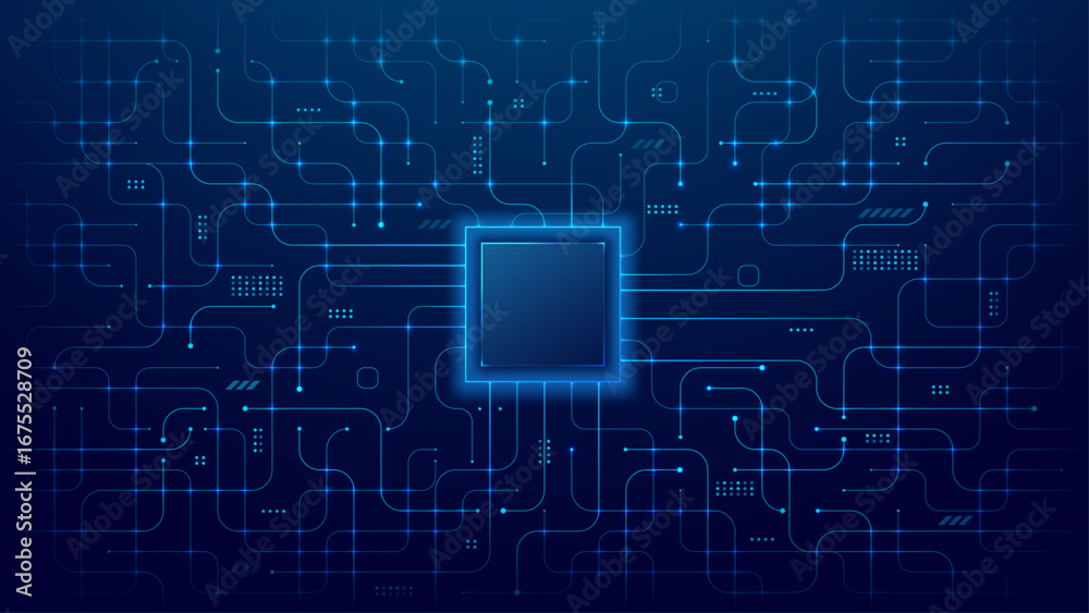 Empty semiconductor on circuit board blue background. AI chip on tech bg. Abstract processor with light blue wires and electronics components. Digital vector illustration. #1675528709