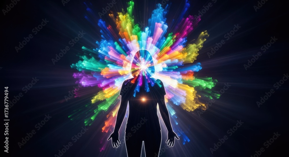 Energetic human silhouette radiating a vibrant explosion of colorful light beams, representing an inner glow, spiritual awakening, and positive energy flow against a dark, abstract background #1736779494