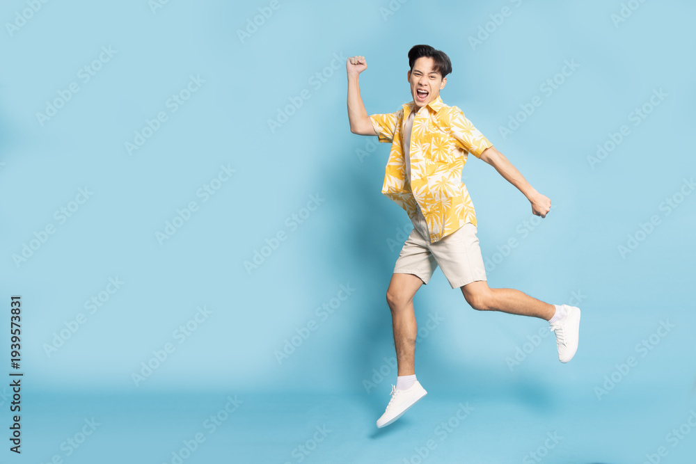 Energetic young Asian man in a yellow floral Hawaiian shirt and beige shorts jumping for joy against a blue studio background. Perfect for summer travel, vacation vibes, and seasonal promotions. #1939573831