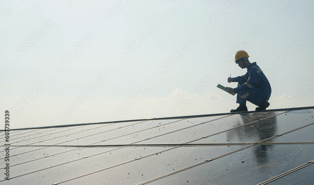 Engineer checking solar panels, solar energy, renewable energy, low key lighting. #607739339