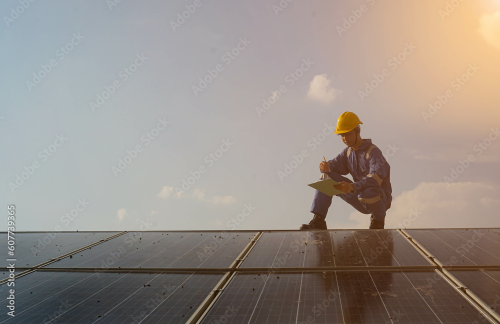 Engineer checking solar panels, solar energy, renewable energy, low key lighting. #607739365
