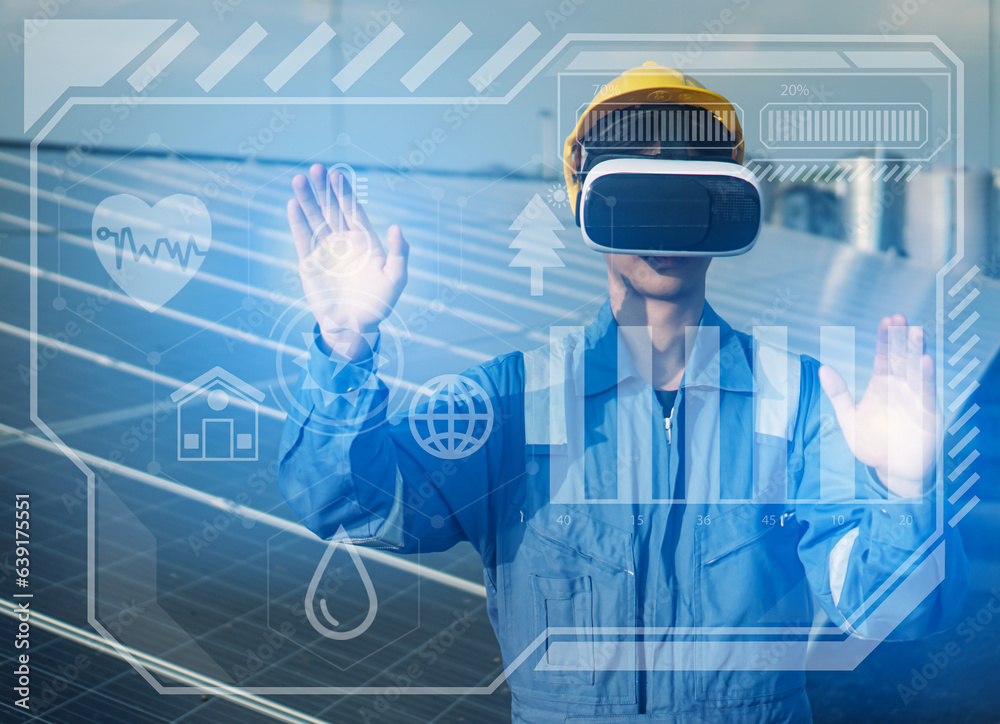 Engineer inspect and check solar cell panel and wearing vr glasses to view solar panel information renewable energy power factory concept lowkey lighting. #639175551