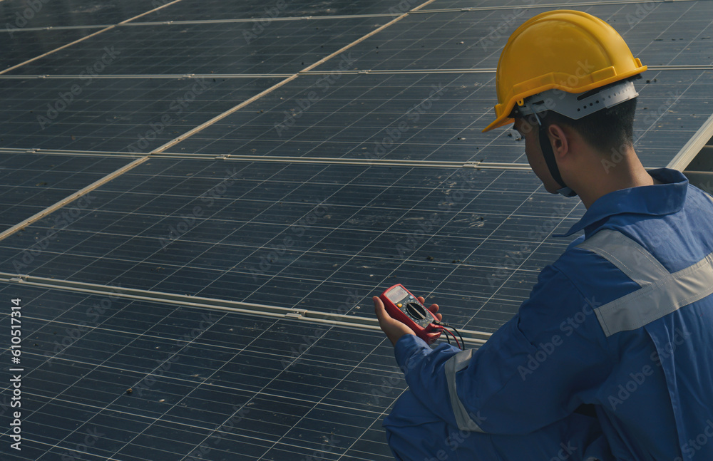 Engineer inspect and check solar cell panel by hold equipment box, solar energy, renewable energy,power factory concept, lowkey lighting. #610517314