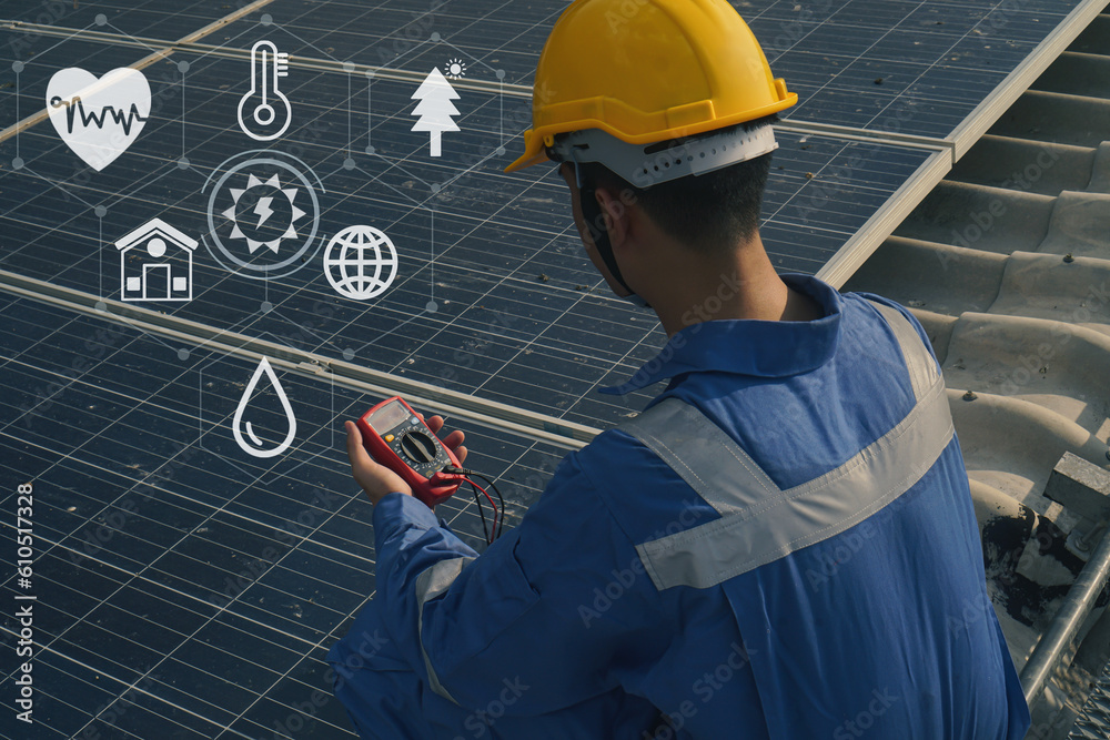 Engineer inspect and check solar cell panel by hold equipment box, solar energy, renewable energy,power factory concept, lowkey lighting. #610517328