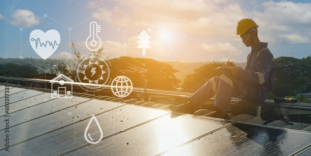 Engineer inspect and check solar cell panel by hold equipment box, solar energy, renewable energy,power factory concept, lowkey lighting. #610517335