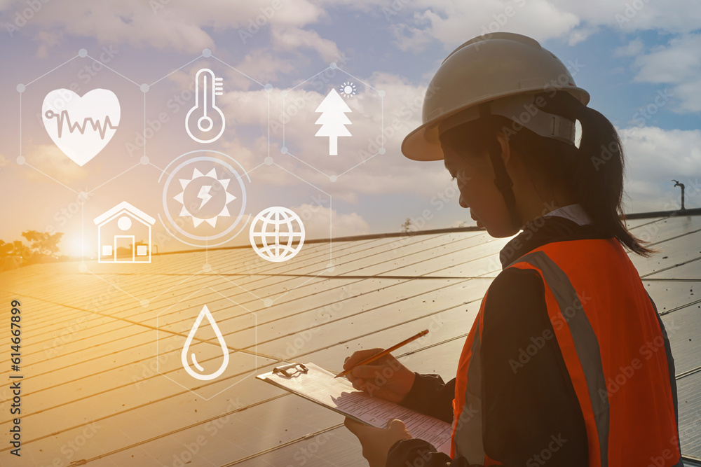 Engineer inspect and check solar cell panel by hold equipment box, solar energy, renewable energy,power factory concept, lowkey lighting. #614667899