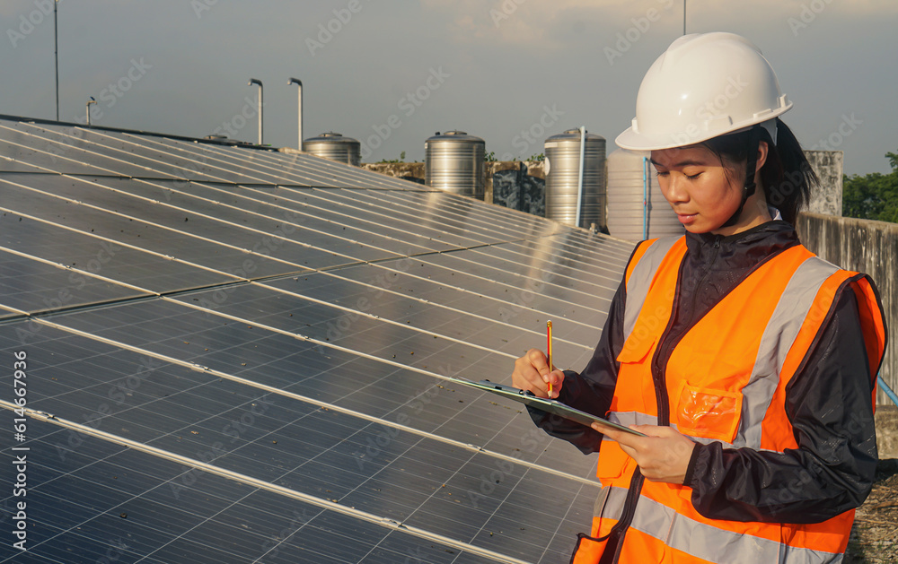 Engineer inspect and check solar cell panel by hold equipment box, solar energy, renewable energy,power factory concept, lowkey lighting. #614667936