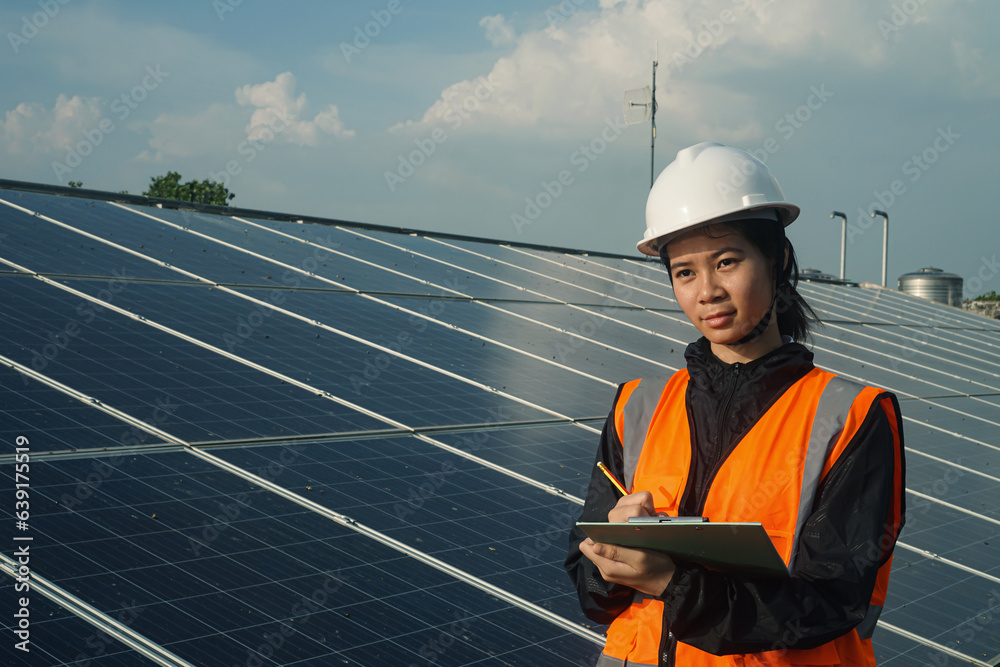 Engineer inspect and check solar cell panel by hold equipment box, solar energy, renewable energy,power factory concept, lowkey lighting. #639175519