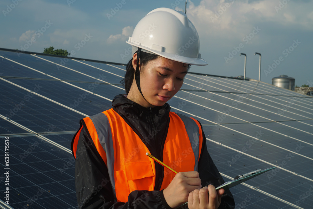 Engineer worker technology solar cell, Asian engineer working on roof top factory checking solar cell power system for project reduce usage electricity in factory #639175516