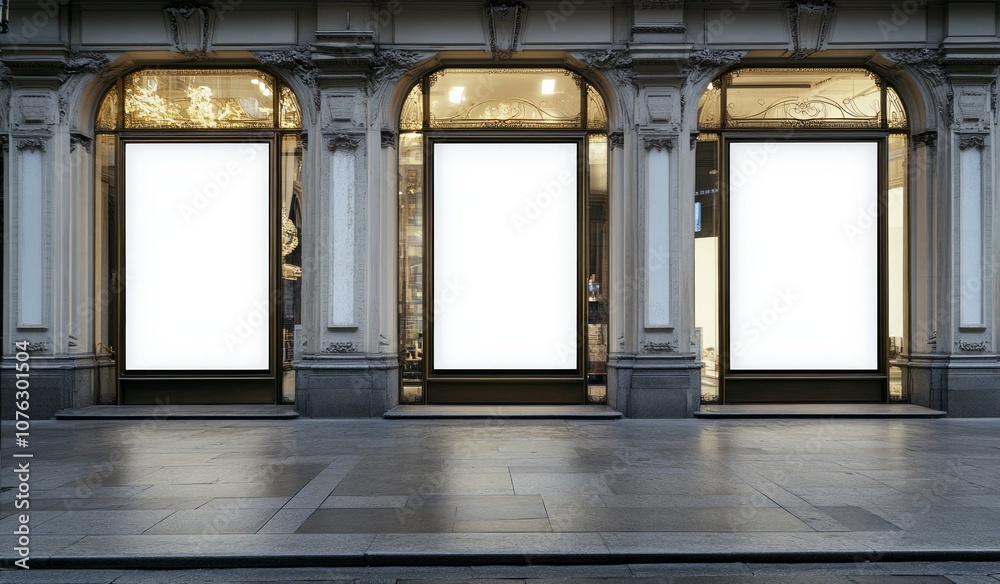 entrance to an old luxury store white blank posters #1076301504