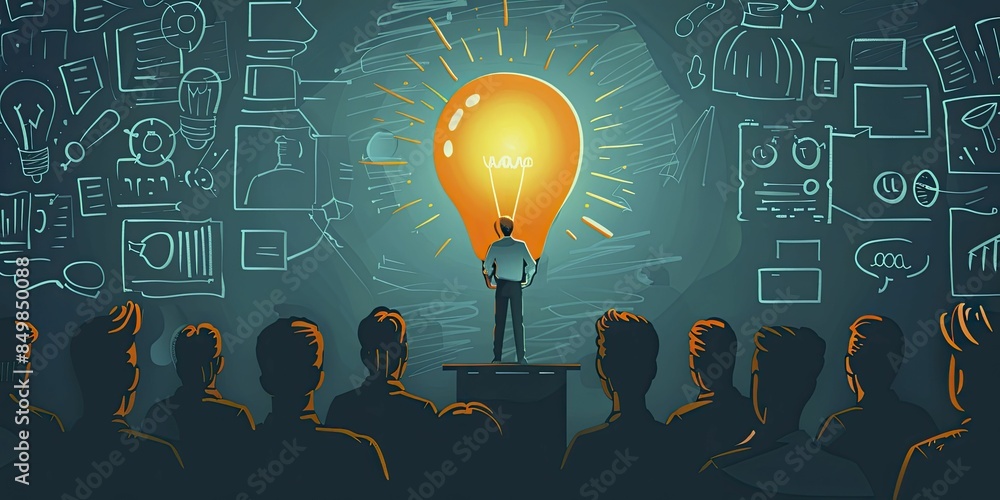 Entrepreneurial spirit shown through a startup founder pitching ideas to investors. #849850088