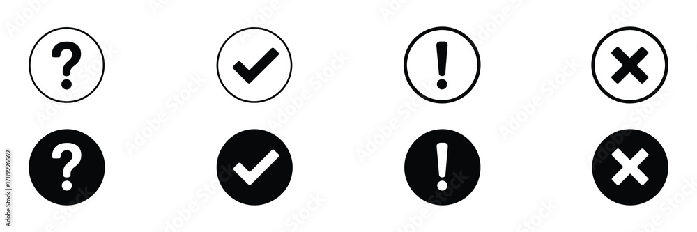Essential interface icons set: question mark, checkmark, exclamation mark, cross, in outlined and filled round styles. isolated on white background #1789996669