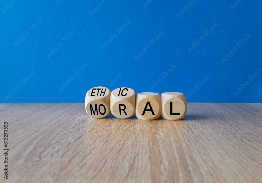 Ethical or moral symbol. Businessman turns wooden cubes and changes the word 'moral' to 'ethical' on a beautiful wooden table, blue background. Business and ethical or moral concept. Copy space. #613279333