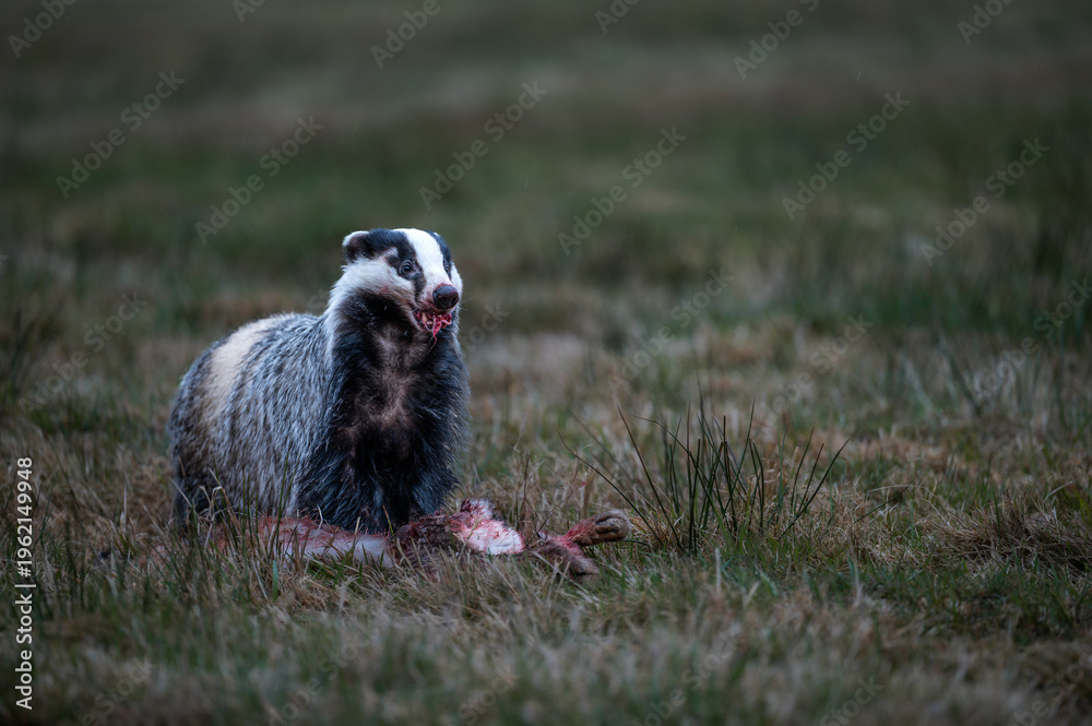 European badger (Meles meles) feeding on animal carcass in a field #1962149948