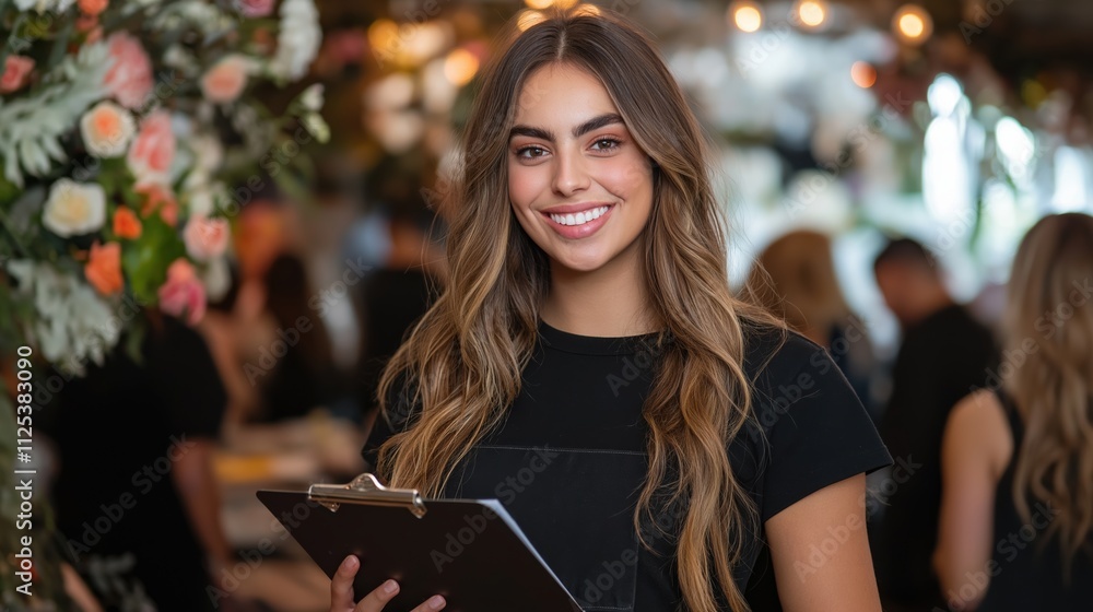 Event coordinator with clipboard among floral decorations. Hospitality management concept #1125383090