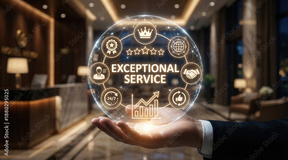 Exceptional customer service concept in a luxury hotel,showcasing icons for client satisfaction,quality assurance,24/7 support,trust and loyalty in hospitality industry #1880295025