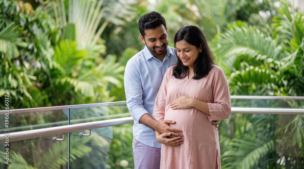 Expectant Indian couple smiles, husband holds wife's pregnant belly. #1968266017