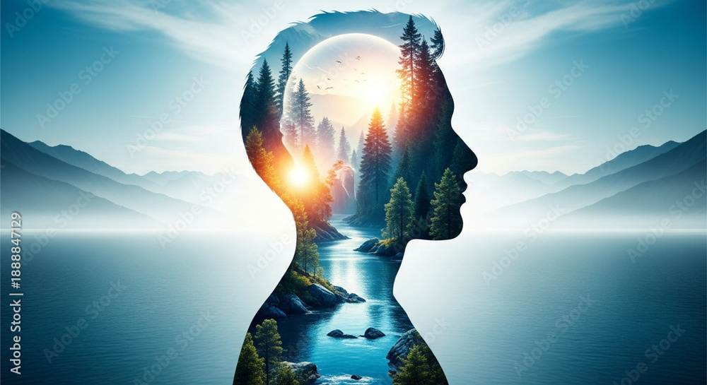 Exploring the expansive inner landscape of human consciousness, where serene nature scenes like mountains, forests, and rivers reflect peace and profound thought #1888847129