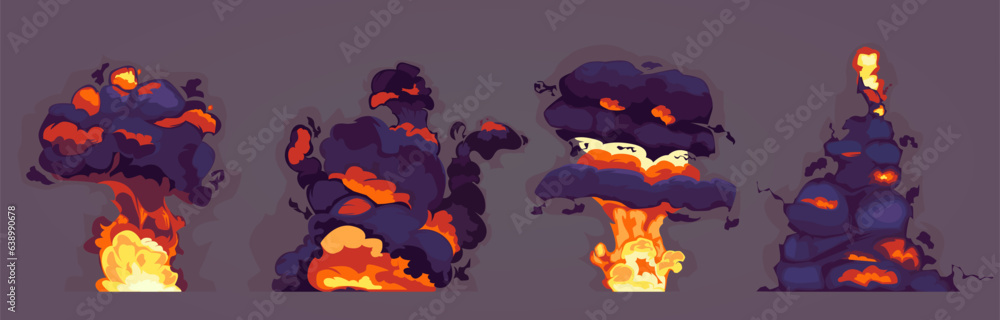 Explosion, detonation, bomb explosion, flame column, fire. Colorful set of explosions, blast wave, mushroom explosion, massive explosion, fireball. Visual effects, vfx. Vector cartoon illustration. #638990678