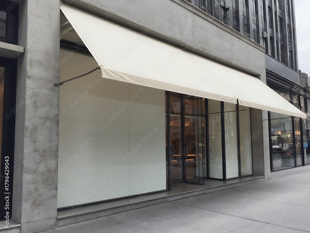 Exterior de tienda moderna en calle urbana, gran toldo de lona blanco en blanco y escaparate de cristal, arquitectura comercial. #1796429043