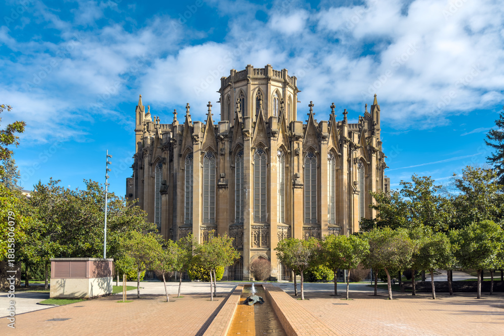 Exterior view of the Cathedral of Mary Immaculate, a Gothic Revival landmark in Vitoria-Gasteiz, Basque Country, Spain. Sunny day with blue sky and clouds, urban park and trees in the foreground. #1885806079