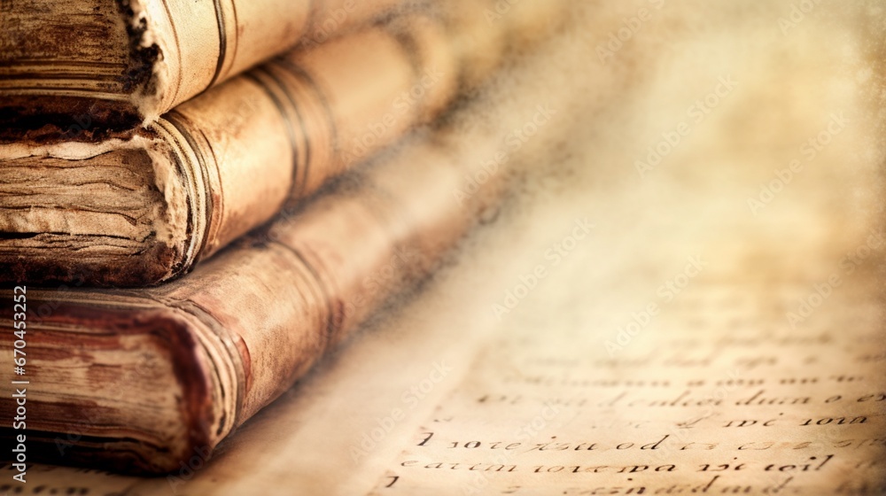 Extreme close-up of abstract blurred ancient manuscripts, antique parchment beige and faded ink hues, in the style of gradient blurred #670453252