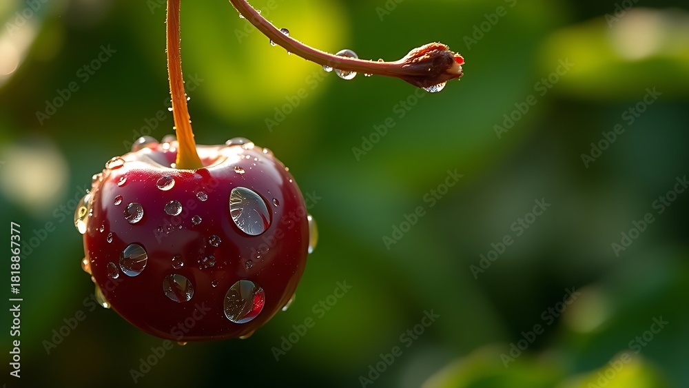 Extreme macro shot of a single dew-covered cherry, with morning light reflecting on water droplets. #1818867377
