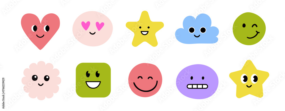 Face smile emoji doodle icon sticker set. Cute kid doodle hand drawn style funny face emoji smile, happy, sad sticker. Funny cartoon emoticon heart, star, flower shape. Vector illustration #1766239429