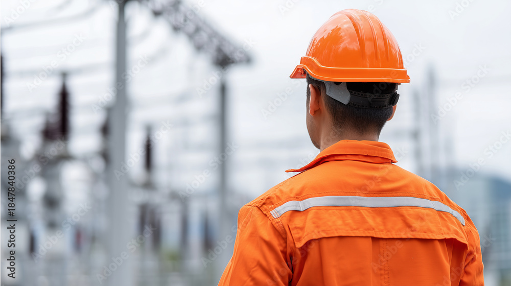 Faceless engineer working at high voltage power substation, heavily defocused electrical infrastructure background, anonymous professional performing inspection and check, ensuring #1847840386