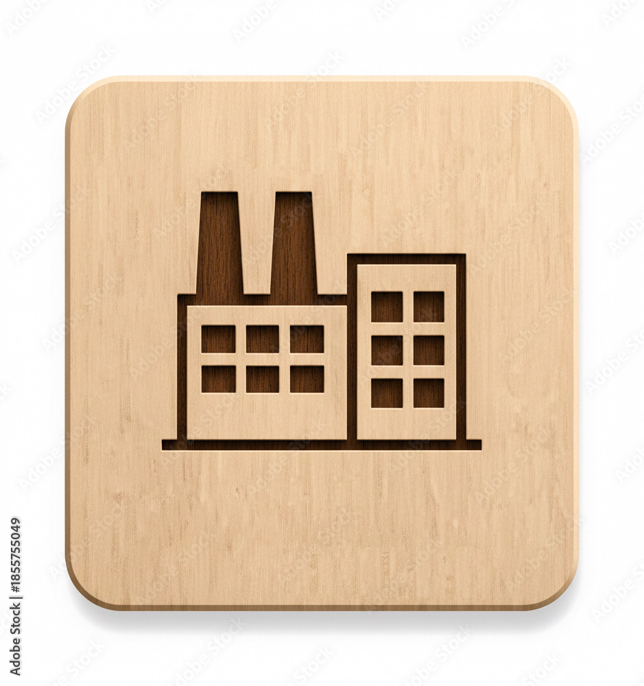 Factory Icon Engraved on a Wooden Block Representing Sustainable Industry and Manufacturing #1855755049