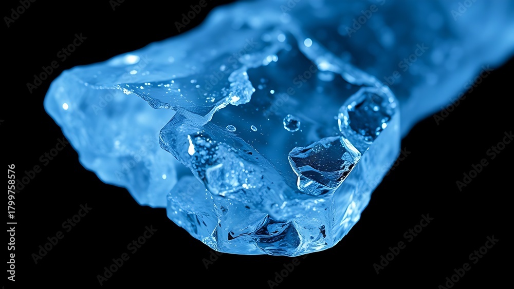 faint. A close-up macro shot of a pristine glowing ice crystal emitting faint electric blue arcs of light as it fractures. STEM education sheets. #1799758576
