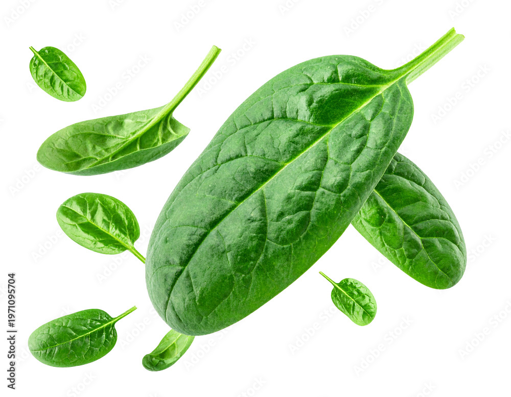Falling fresh spinach leaves isolated on white background, group of flying green baby spinach with motion for healthy food and smoothie compositing #1971095704