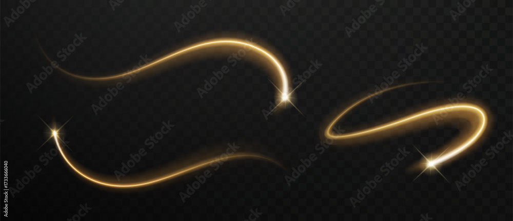 Falling gold star sparkle set. Glowing magic line with dust swirl and shiny flare vector #1733666040