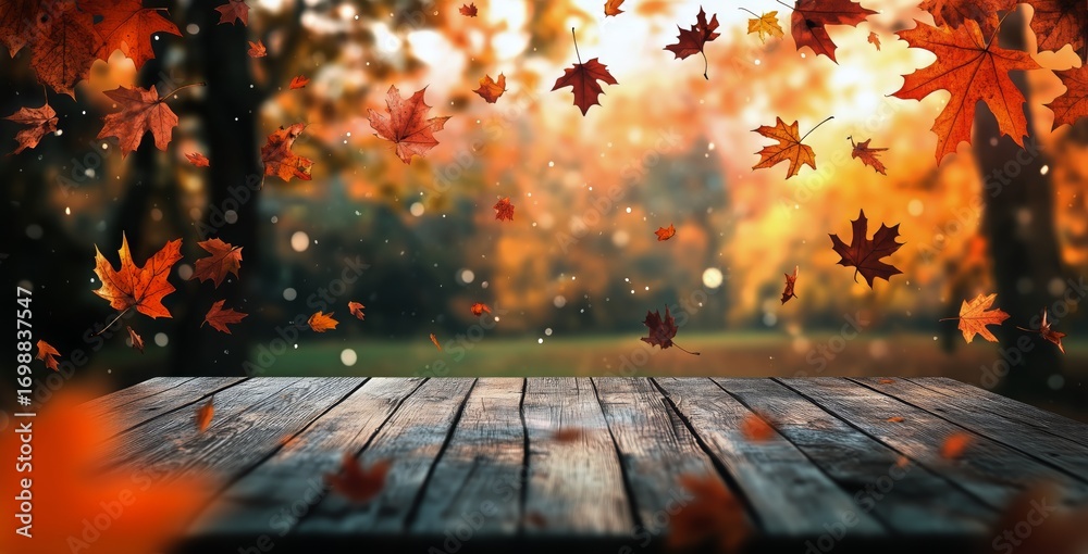 Falling Maple Leaves in Autumn on Table With Trees Background During Daytime #1698837547