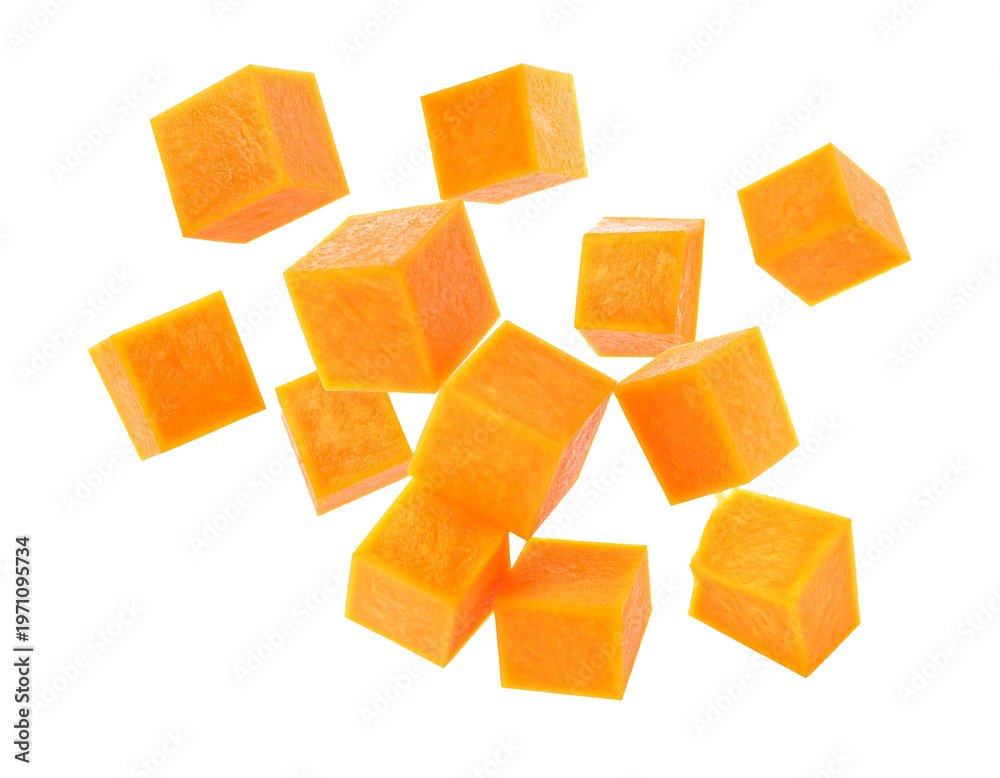 Falling pumpkin cubes isolated on white background, flying orange squash dice with motion for healthy autumn cooking and food compositing #1971095734