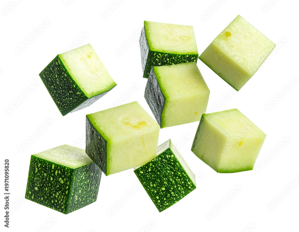 Falling zucchini cubes isolated on white background, group of flying courgette dice with motion for healthy cooking and food preparation compositing #1971095820
