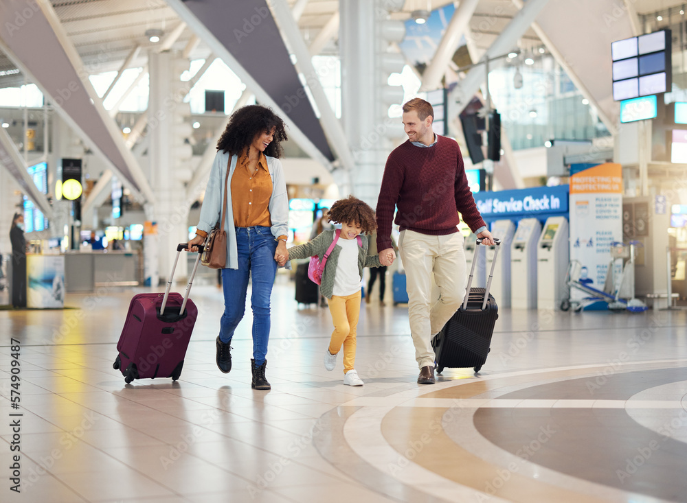 Family, holding hands at airport and travel with suitcase parents and child walking, ready for vacation and flight. Trust, adventure and people together at airline, transportation and journey #574909487
