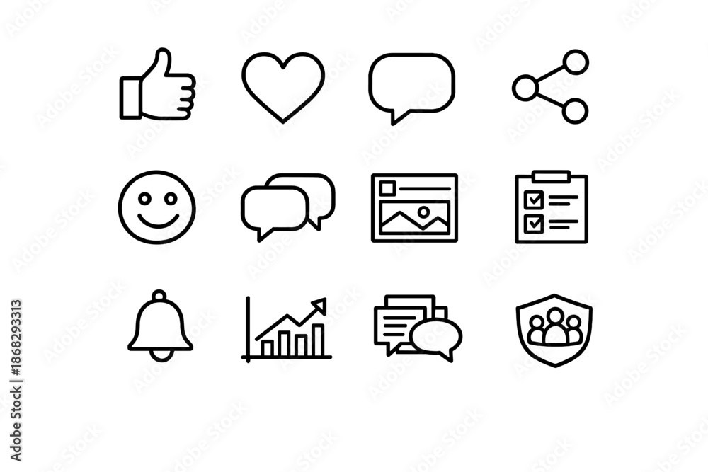 Fan Engagement Icons. Fan Engagement. Line outline icon set of fan engagement: thumbs up, heart icon, comment #1868293313
