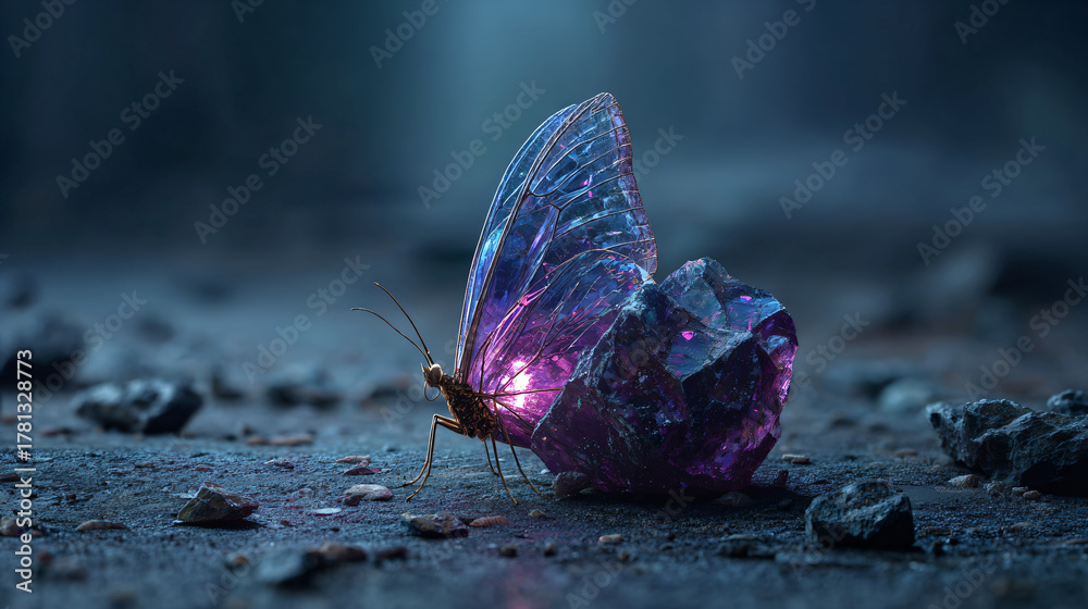 fantasy amethyst glow with butterfly, mystical gemstone still life, magical purple crystal dream #1781328773