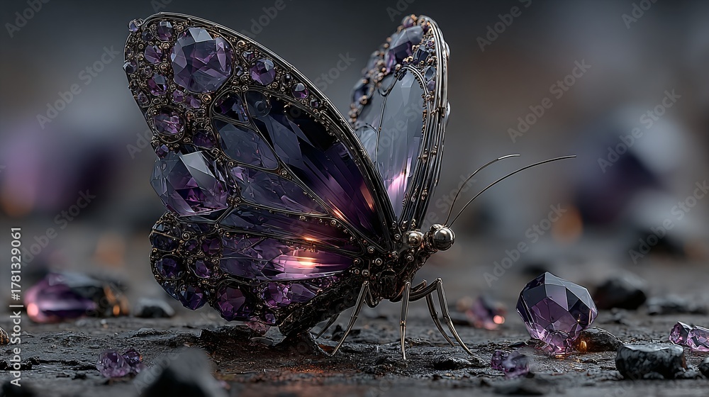 fantasy amethyst glow with butterfly, mystical gemstone still life, magical purple crystal dream #1781329061