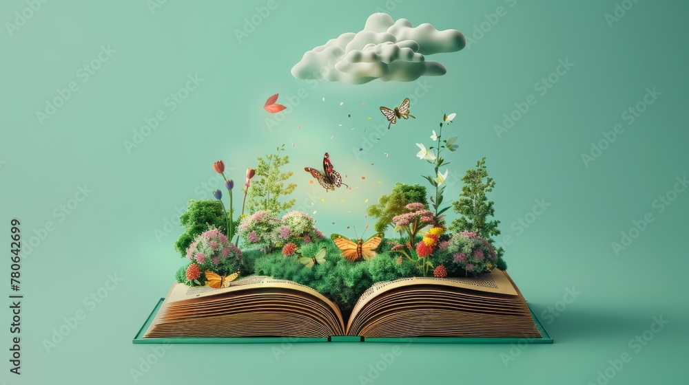 Fantasy and literature concept. 3D style Illustration of magical book with fantasy stories inside it. The concept for World Book Day background with copy space. Beautiful background. #780642699