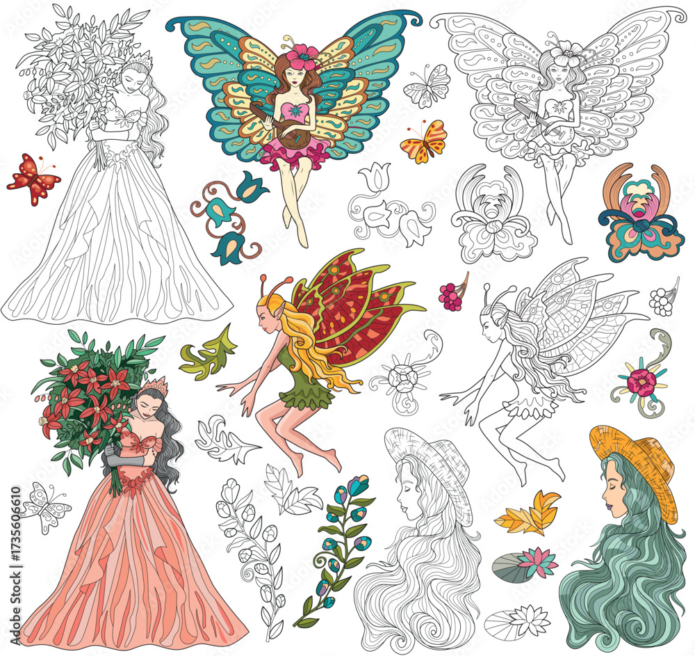 Fantasy design set with beautiful fairy Elf princess and floral elements. Vector line art illustrations for clipart, stickers, coloring book isolated on white background. #1735606610