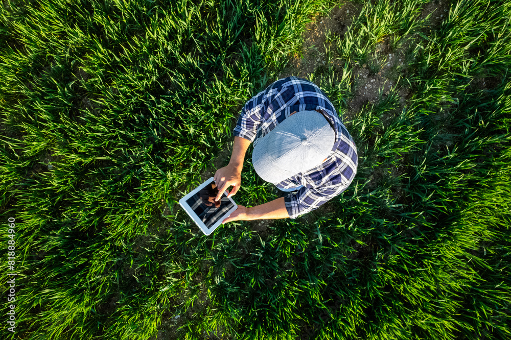 Farmer using tablet in wheat field. View from above of a farmer in blue shirt using a tablet in a young wheat field.High quality photo #818884960