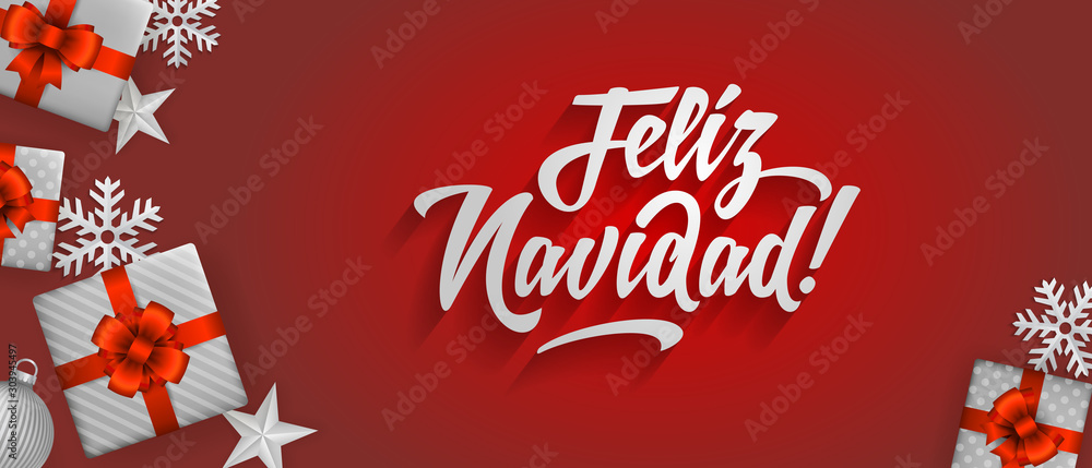Feliz Navidad - Merry christmas in spanish language red flat card template design elements, snowflakes, stars and calligraphy #303945497