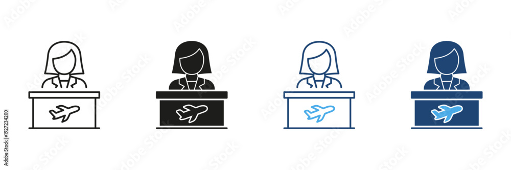 Female Airport Check-In Desk Attendant Icon Set. Airline Customer Service And Travel Assistance Symbol Collection. Aviation Industry And Passenger Support. Isolated Vector Illustration #1927234200